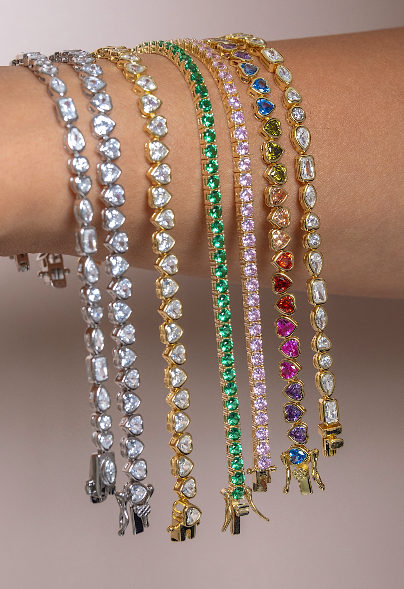 Rosé Rally Bracelet from our Courtside Romance collection, made from 925 sterling silver plated with 14k gold and set with soft pink cubic zirconia stones in a classic tennis setting with a length of 17cm.